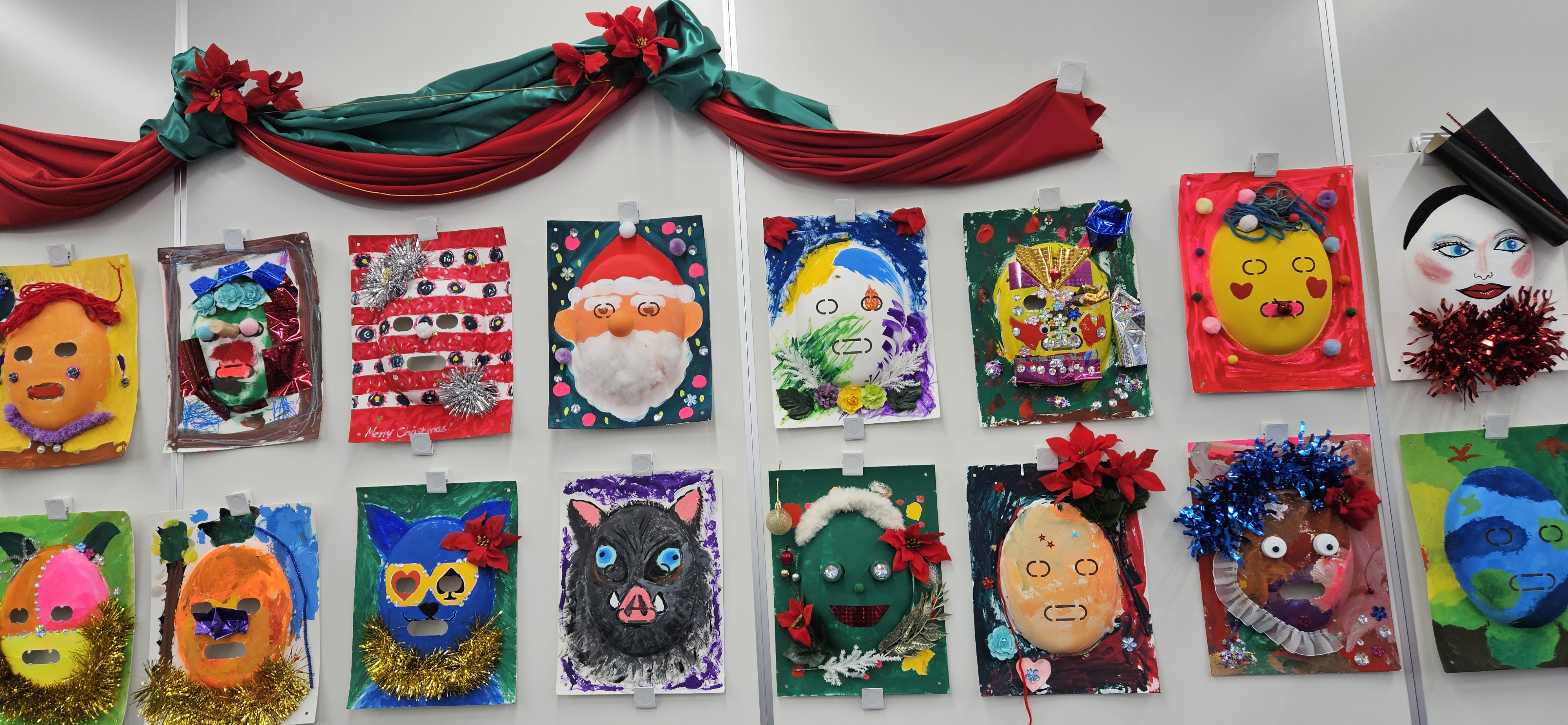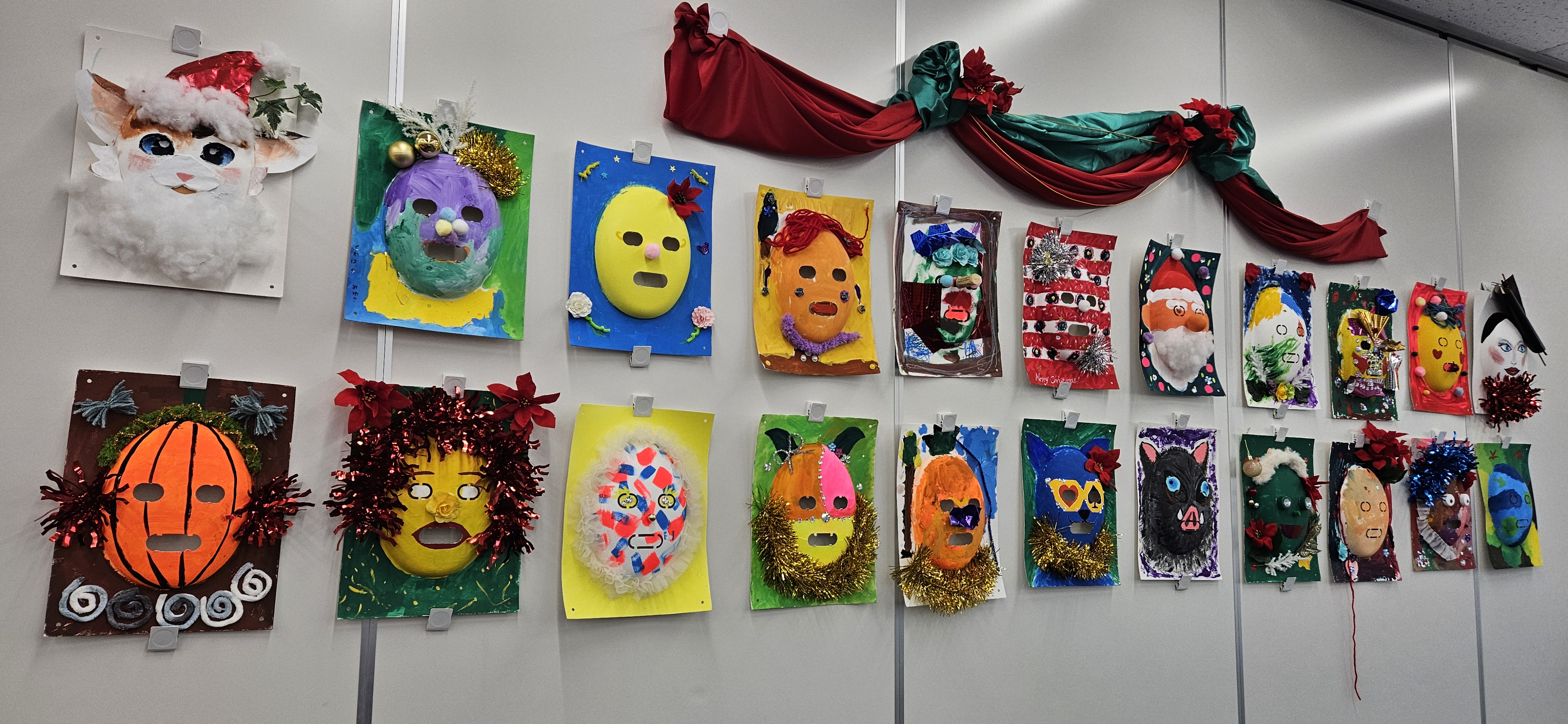 本年もたくさんの絵の具や装飾グッズで素敵なお面がたくさん出来上がりました。